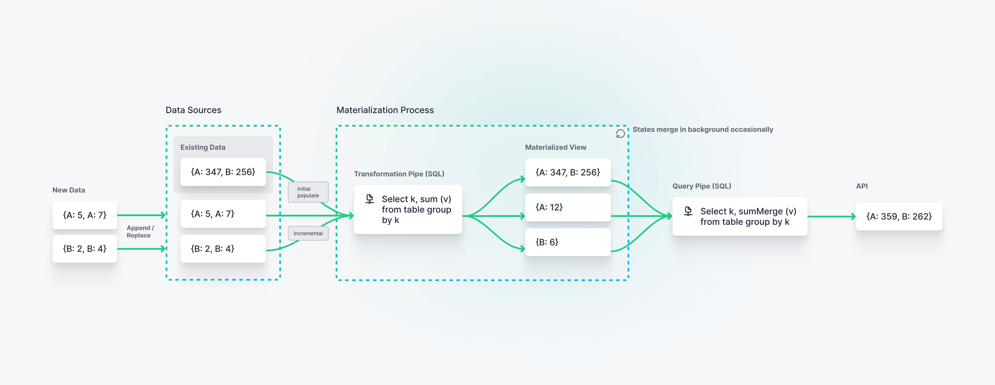 For example, in Tinybird (a real-time data platform that supports real-time data visualizations), you can create real-time Materialized Views that pre-filter and pre-aggregate results at data ingestion time. These results are stored on disk and can be queried much more quickly than if you filtered and aggregated over the raw table at query time.