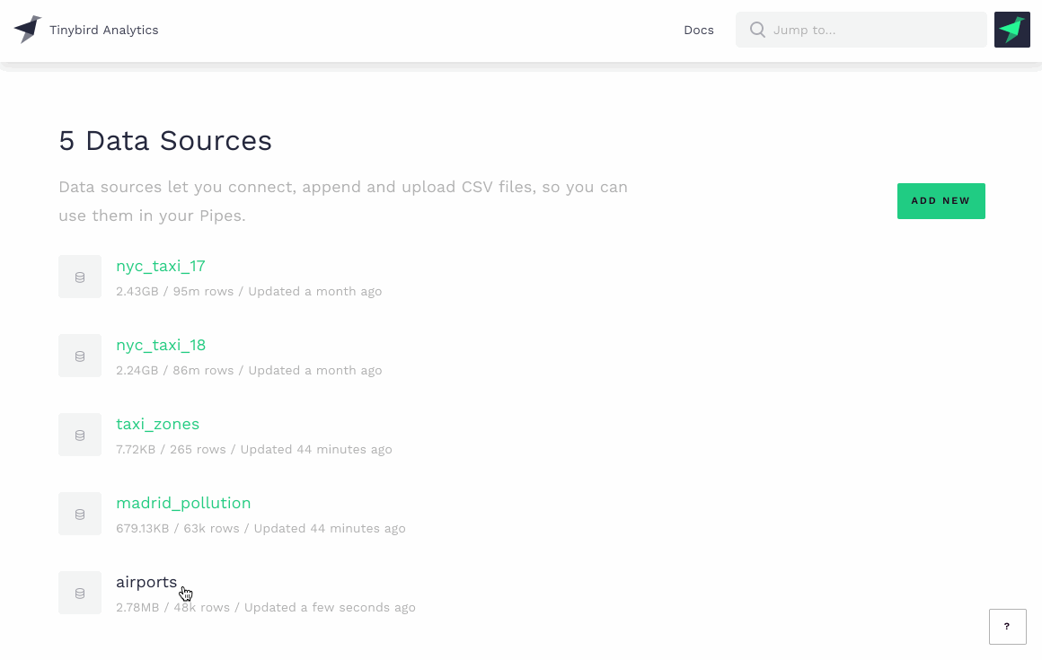 Whenever you build a data pipe in Tinybird Analytics, your transformation nodes will always remain connected to the Data Sources they use. As soon as those Data Sources change, all their related transformation nodes will be recalculated in real-time. No delays.