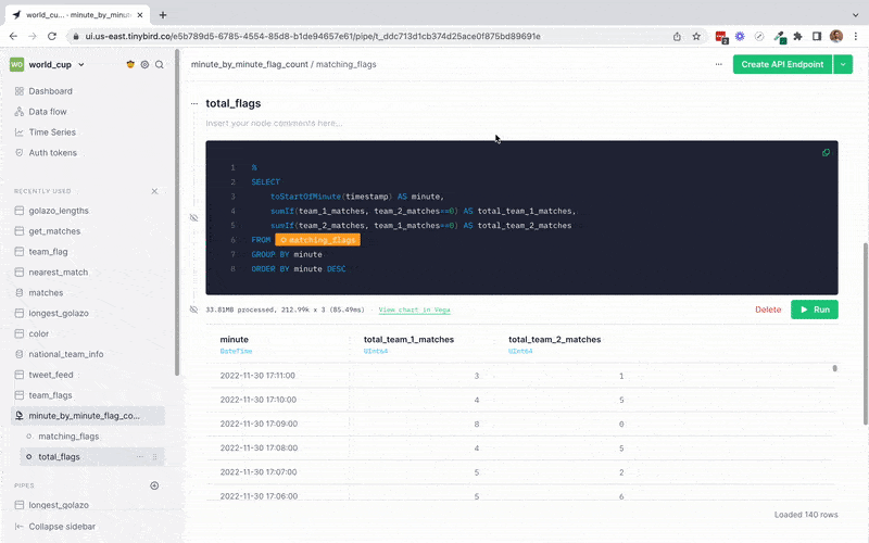 I used SQL in Tinybird to calculate the total number of flag emojis used for each team per minute where only one team was mentioned in a Tweet.