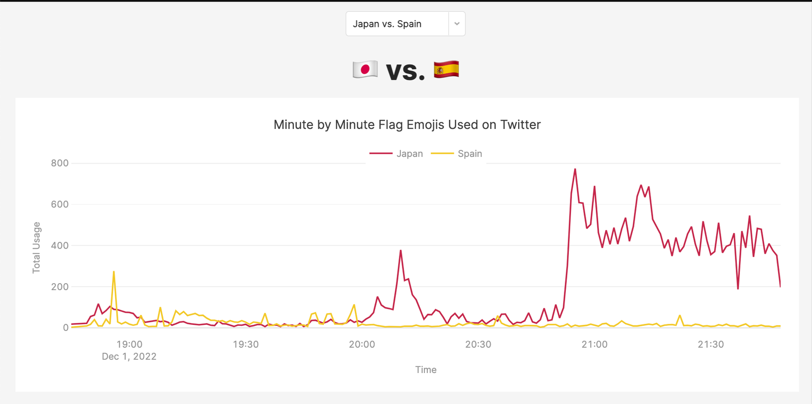 My hypothesis was correct! Twitter took to “waving the flag” of the victorious countries, releasing its collective fan emotion in a burst of flag emojis whenever a goal was scored or a match ended.
