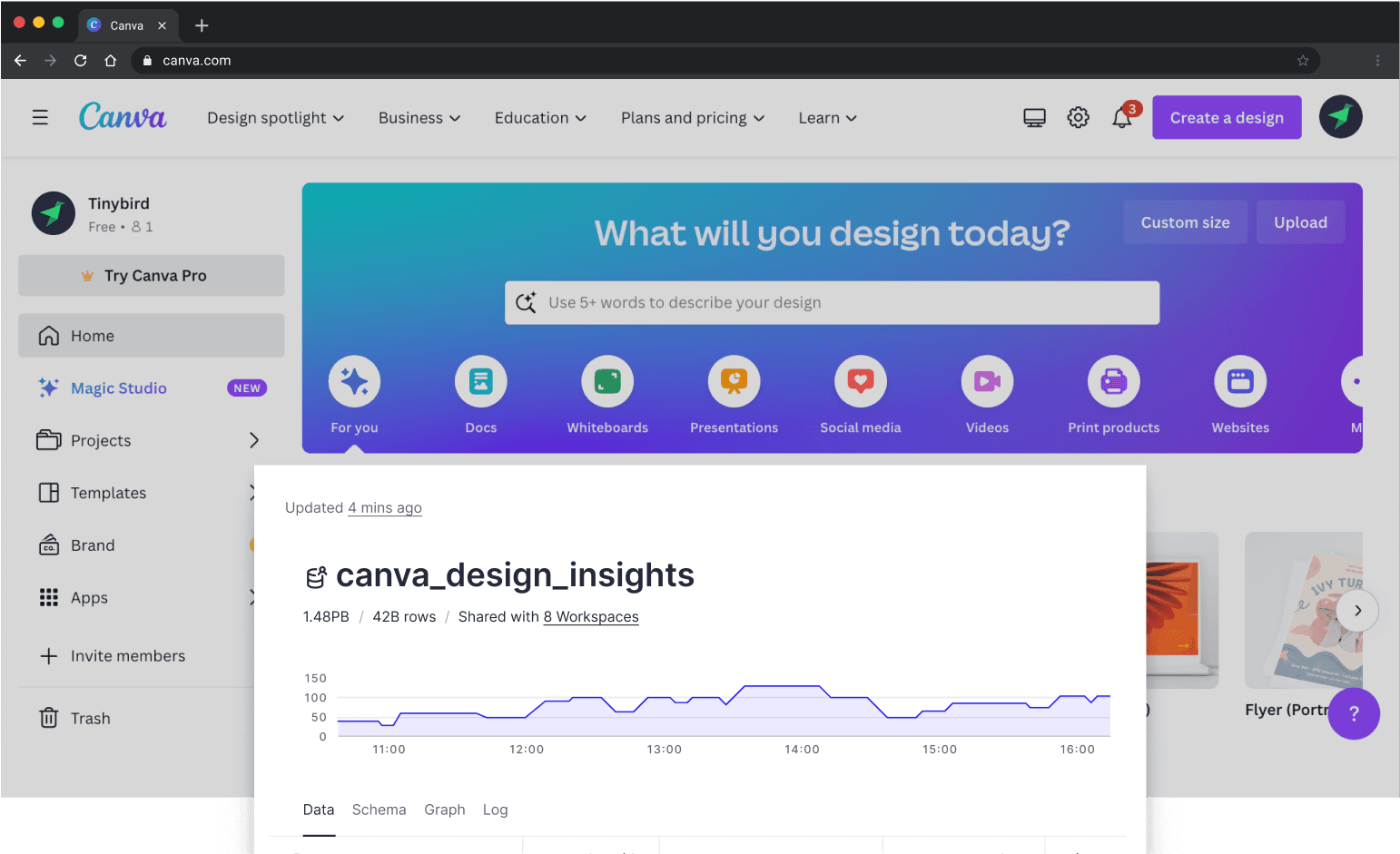 Canva is a platform for creators, and creators want to understand the performance of their creations in an instant. With Tinybird, Canva has created a Creator Insights feature that shows customers live analytics on content views and engagement, helping creators develop the kinds of content that their customers love.